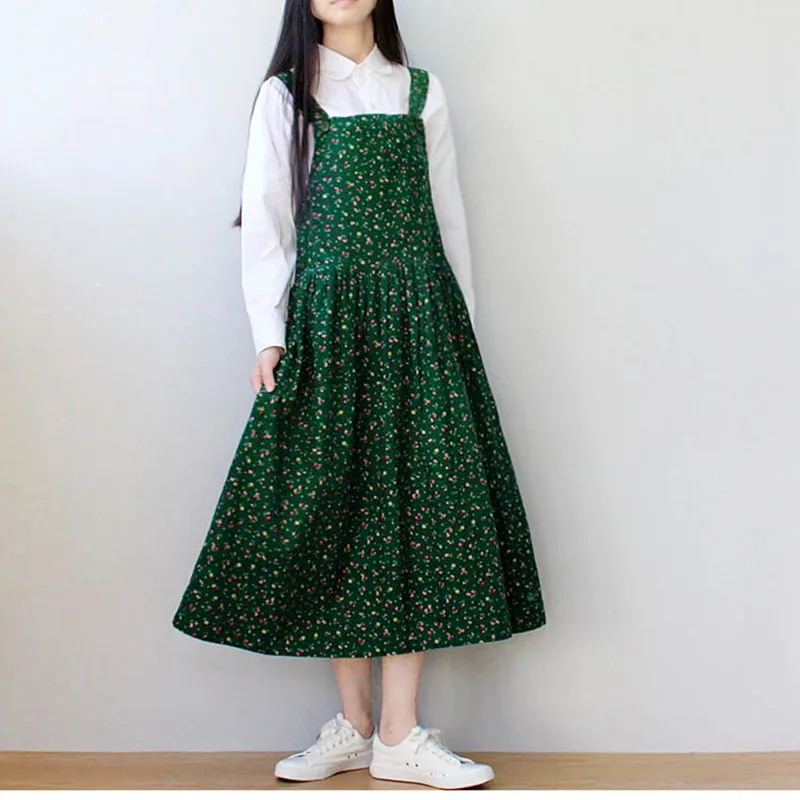 Best Offer Free Shipping 2019 New Fashion Corduroy Spring And Autumn Women Long Mid-calf Flower Print S-XL Vintage Green Sleeveless Dresses