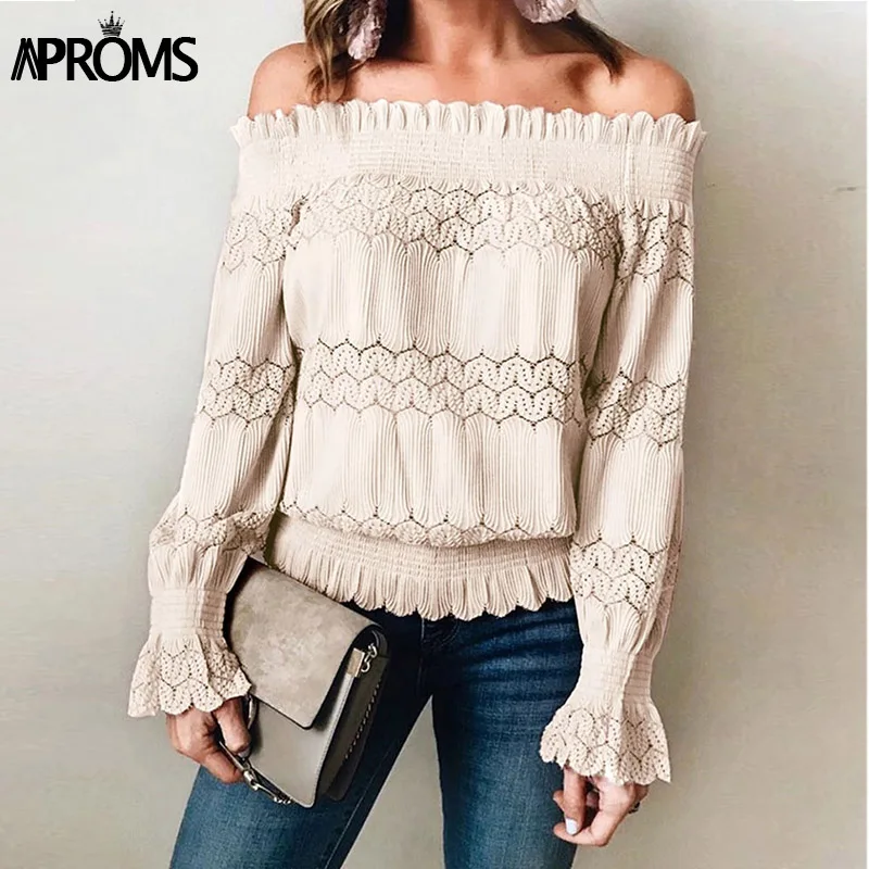 Buy Aproms Elegant Off Shoulder Lace Shirt Women Spring Casual Solid Color Hollow Out Elastic Blouses Ladies Ruffled Tops 2020 New