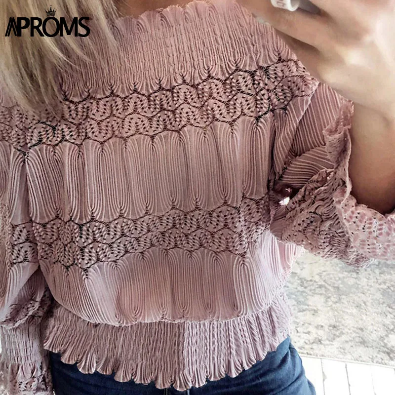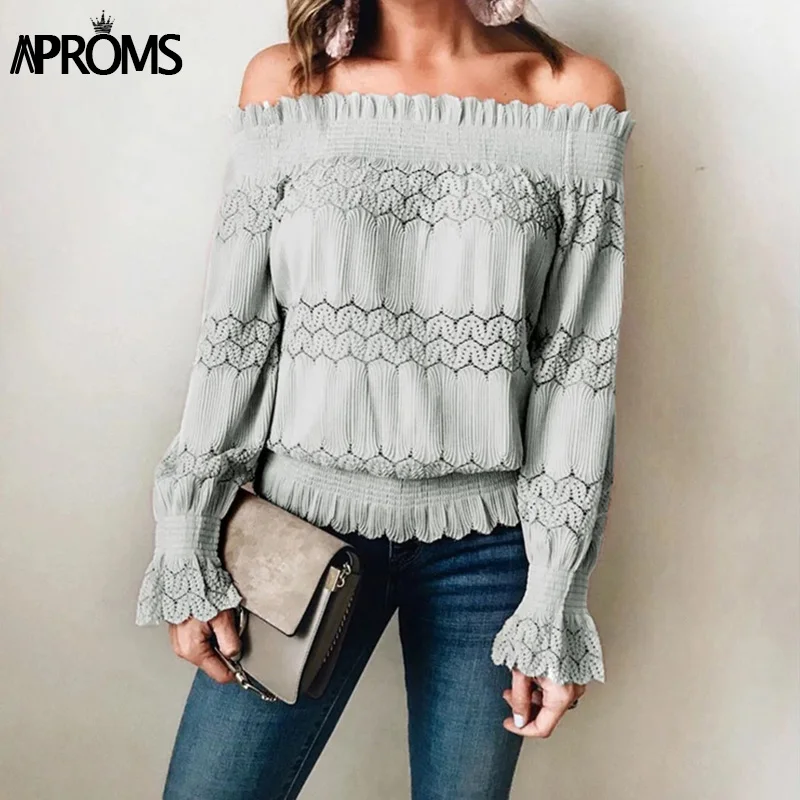 Images of Aproms Elegant Off Shoulder Lace Shirt Women Spring Casual Solid Color Hollow Out Elastic Blouses Ladies Ruffled Tops 2020 New :